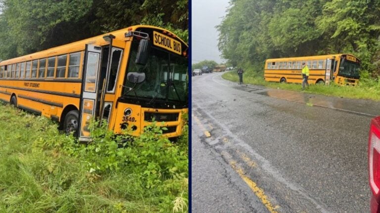 Images from the crash show that the SUV came to rest against the pole with its hood smashed, while the school bus was run off the main road and into a ditch.
